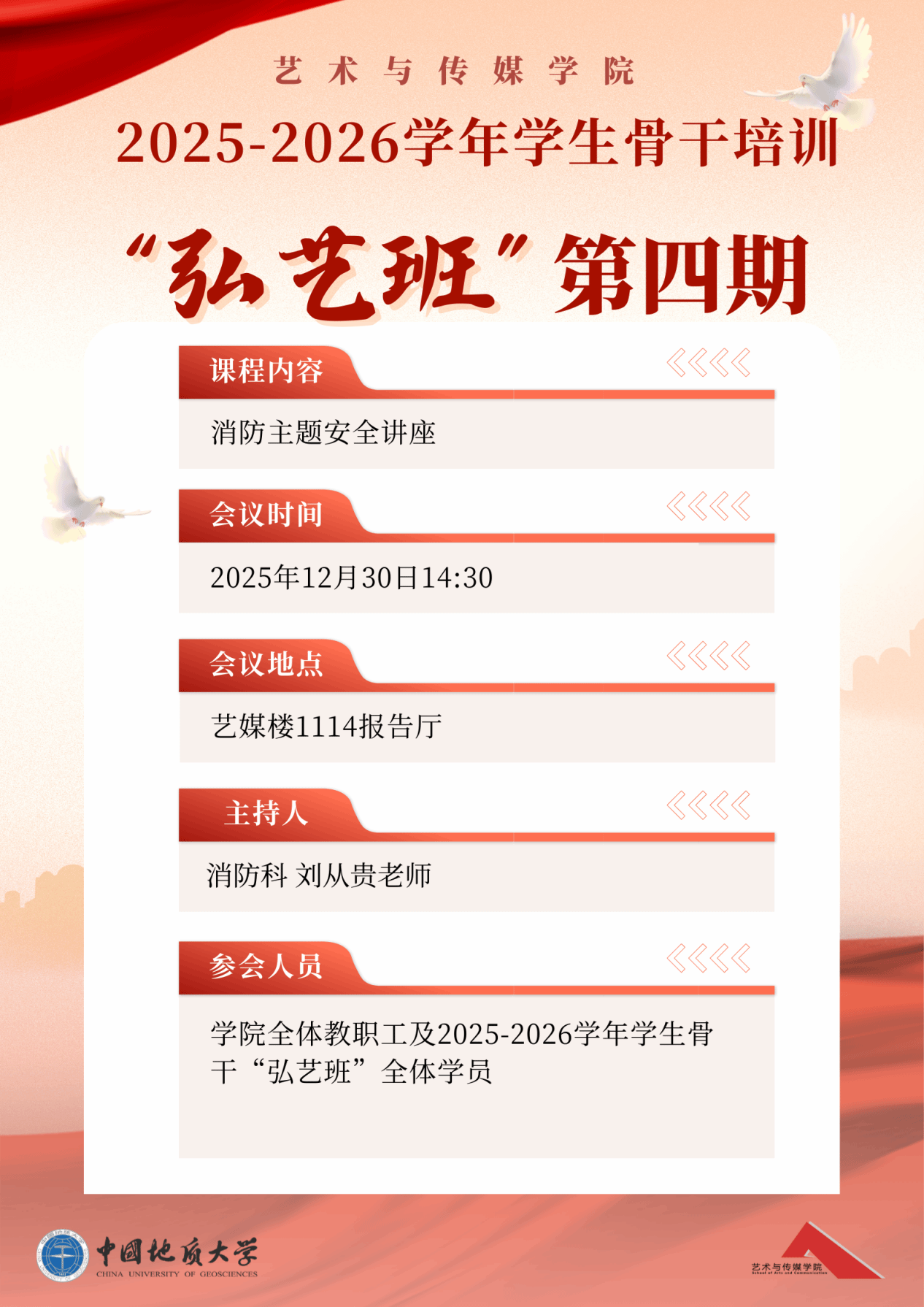 在艺媒楼1114报告厅顺利开展2025-2026学年学生骨干培训“弘艺班”第四期,本次消防主题安全讲座由安全保卫部消防科科长刘从贵老师主讲,聚焦于筑牢校园安全防线,助力同学们增强消防意识、提升突发事件应对水平。学院全体教职工,研究生会、学生会、分团委全体学生骨干,各班班委,楼栋长,楼层长,寝室长参加了本次培训。
