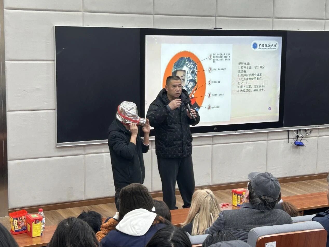此外,刘老师还现场演示了消防面具的正确佩戴及使用方法,为大家系统梳理消防核心常识,反复强调要牢记校园专属火警电话: 67883110,引导同学们将安全意识内化于心、外化于行,切实筑牢校园消防安全防线。